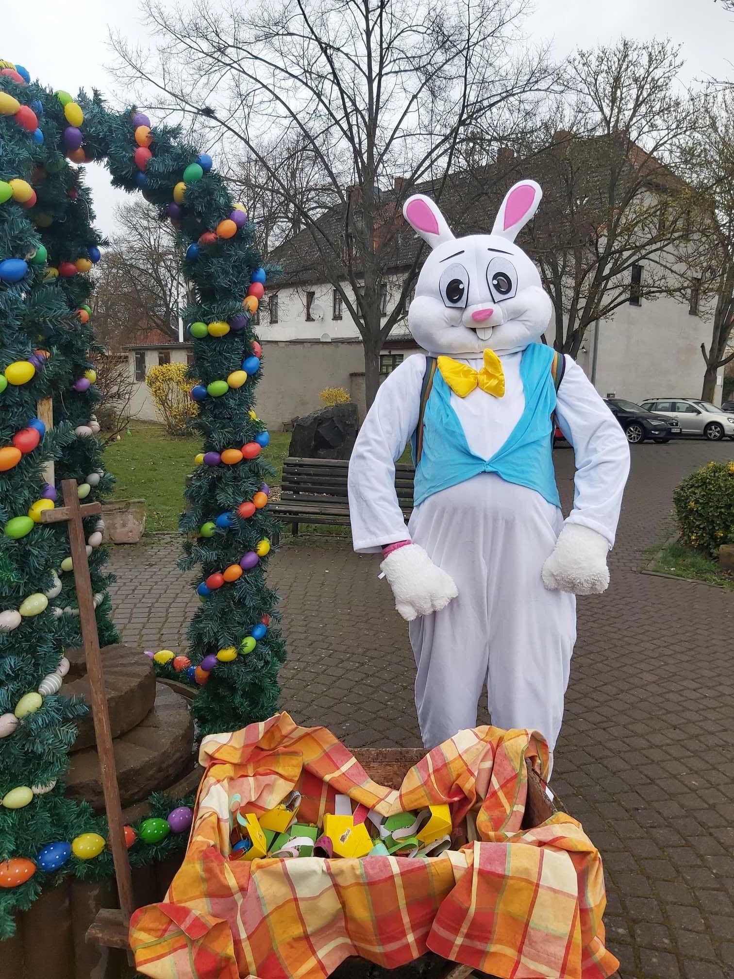 Im Anschluss machten sich die Kinder auf die Suche nach dem angekündigten Osterhasen. Als dieser schließlich erschien, strahlten die Kinderaugen: Für jedes Kind hatte er ein bunt gefülltes Osterkörbchen dabei.